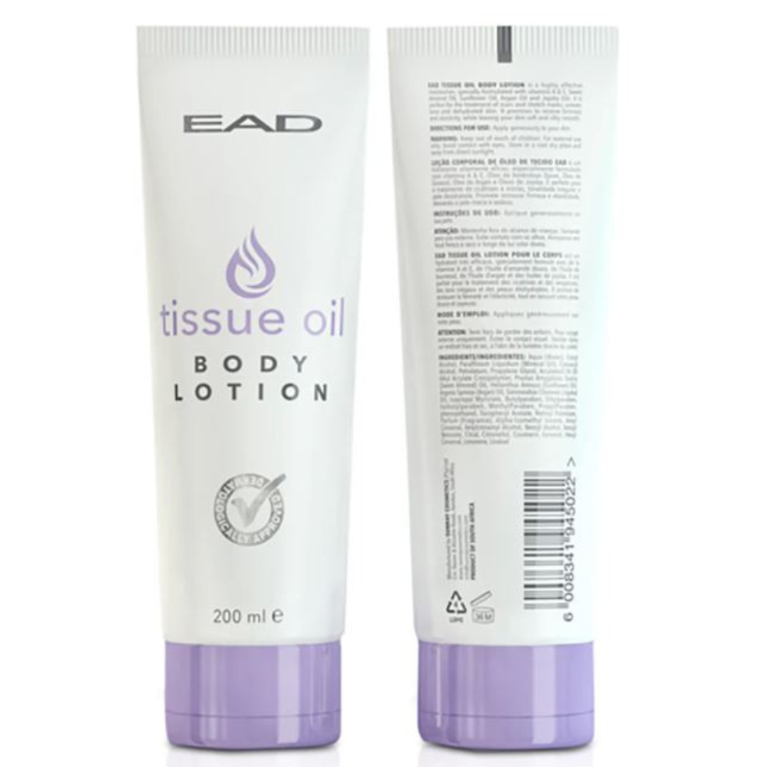 Formulated for Numerous Skin Concerns EAD Tissue Oil Body Lotion is a highly effective skin moisturizer that is intensely hydrating and can be used as an all over body lotion, perfect for healing exceptionally dry areas such as the elbows, knees, and hands. It is specially formulated to improve the skin’s health and can be used on all skin types. EAD Tissue Oil Body Lotion can improve the appearance of both new and old scars and stretch marks that have occured due to pregnancy, rapid weight gain, and growth spurts. The body lotion contains Vitamins A and E, proven to reduce the appearance of scars and stretch marks.